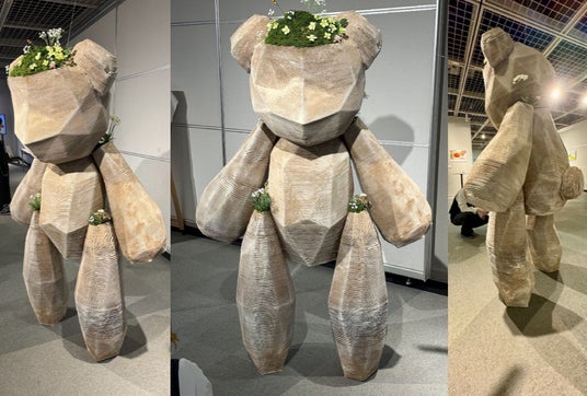 BOLDGYMの学生会員による海洋プラスチックごみと木粉を材料に使った2m超の作品