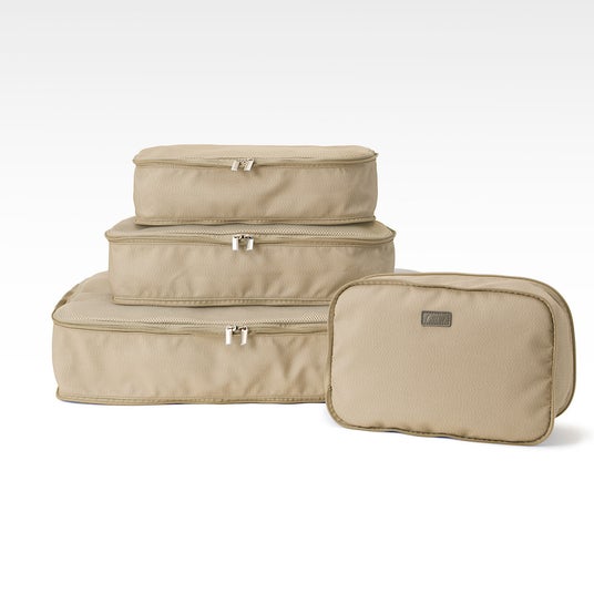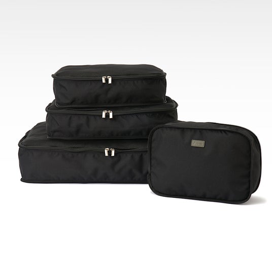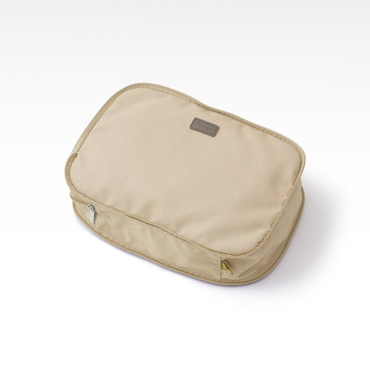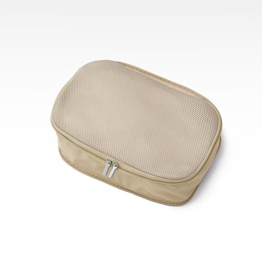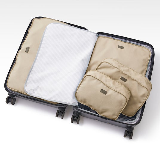 スーツケース内の整理に便利な仕分けケースに圧縮タイプが新登場。ファスナー式で簡単に圧縮でき、かさばる荷物もすっきりパッキングできます。フロント部分には衝撃を吸収するクッション素材を使用しており、大切なものも安心して持ち運びできます。グレー、ベージュ、ブラックの3色展開です。