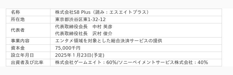 株式会社ゲームエイト(本社:東京都渋谷区、代表取締役社長:沢村 俊介 以下、ゲームエイト)は、ソニーペイメントサービス株式会社(本社:東京都港区、代表取締役社長:中村 英彦 以下、ソニーペイメントサービス)と、ゲームを含めたエンタメ領域における決済にまつわるサービスを展開する合弁会社「株式会社S8 Plus」(以下、S8 Plus)を設立します。なお、設立日は1月23日(木)を予定しております。