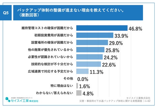 理由として「法定耐用年数(50年)を超えた下水道管が多い」(54.1%)、「老朽化による劣化箇所が増えている」(45.9%)、「バックアップ体制が十分でない」(33.8%)などが挙げられました。