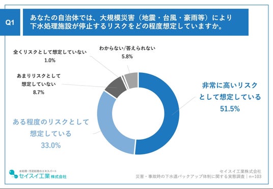 また、大規模災害による下水処理施設停止のリスクについても、「非常に高いリスクとして認識している」が51.5%、「ある程度のリスクとして認識している」が33.0%で、合計84.5%が何らかのリスクを感じていると回答し、過去5年以内に災害や事故で機能停止・処理能力低下を経験した自治体は約半数に達しました。
