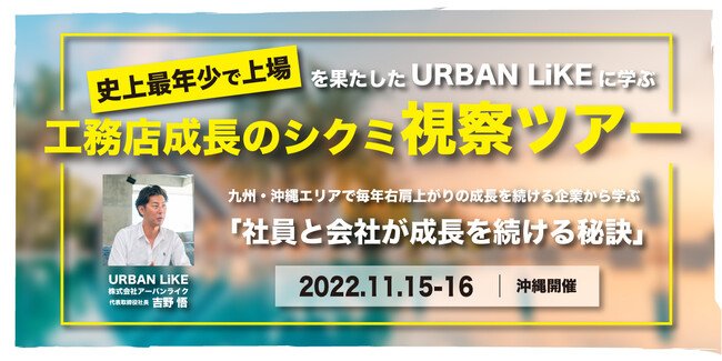 URBAN LiKE INC.(アーバンライク)(本社:福岡市中央区、代表取締役社長:吉野 悟)と、株式会社シンミドウ(本社:埼玉県さいたま市、代表取締役:笹田知弘)は、2022年11月15日(火)に全国の工務店・地域ビルダーを対象とし、『【工務店が上場する秘訣】最短で上場する工夫とは?』をテーマに視察ツアーを開催します。