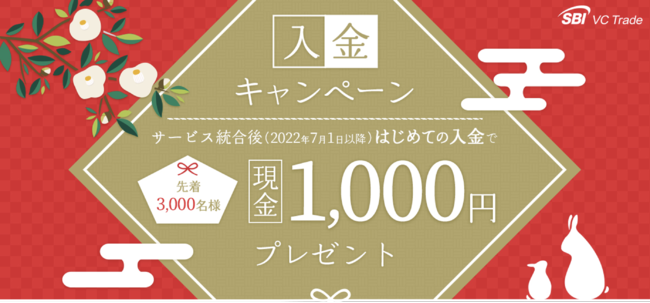 SBIグループにて暗号資産交換業を運営するSBI VCトレード株式会社(本社:東京都港区、代表取締役社長:尾崎 文紀、以下「当社」)は、2023年1月18日(水)より、サービス統合後(2022年7月1日以降)はじめて入金する方、先着で3,000名様にもれなく現金1,000円をプレゼントする入金キャンペーンを実施いたします。