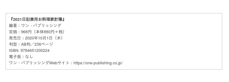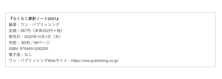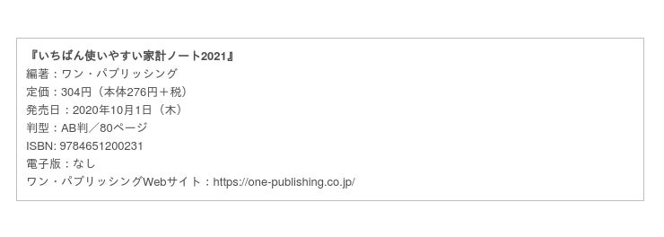 株式会社 ワン・パブリッシング(東京都台東区/代表取締役社長:廣瀬有二)は、「2021日記兼用お料理家計簿」、「いちばん使いやすい家計ノート2021」、「おトクで使いやすい!おはよう!家計簿2021」、「らくらく家計ノート2021」の4種の家計簿を発売しました。