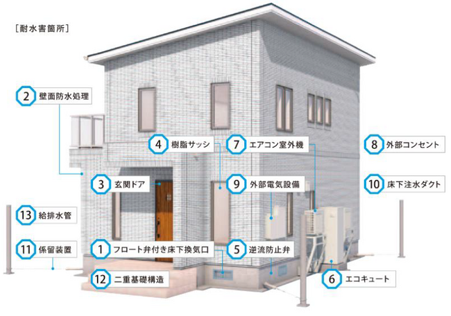 一般的な仕様の住宅において、床下・床上浸水すると考えられる箇所は複数存在します。当社はこれらを危険ポイントと定め、「浸水」「逆流」「水没」「浮力」に分類。建物本体だけでなくサッシ等の開口部の水密性の向上、水の浸入・逆流を防ぐ特殊弁の採用などの対策を施しました(図中1~5)。また、外部の電気設備は、その本体や稼働に関わる部品を水没から免れる高さに設置することで、水害後も電気や給水・給湯などのライフラインを確保しています(図中6~9)。そして、浮力対策として、一定の水位に達した際に「床下注水ダクト」で水をあえて床下に入れて重りにすることで浮上を防ぐ「スタンダードタイプ」(図中10)、及び、浮力に逆らわずに安全に建物を水に浮かせ「係留装置」で元の位置に戻す「浮上タイプ」(図中11~12)の2つの仕様を開発しました。また、「浮上タイプ」の浮上時に、漂流物が建物の下に挟まった場合も、約半日の作業時間で撤去でき、給排水管も簡単に復旧できる方法を確立しました(図中13)。