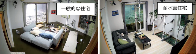 一般的な住宅のリビング(画像左)は浸水し、家具も流されてしまっていますが、耐水害住宅(右)は浸水することなく普段通りのリビングを保っています。(「耐水害住宅」の実物大建物浸水実験にて)