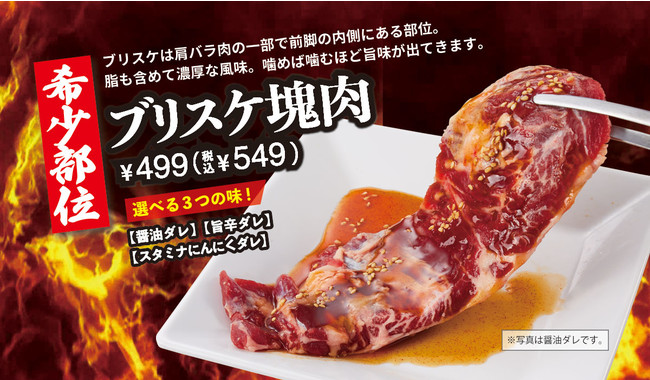 ブリスケは肩バラ肉の一部です。噛めば噛むほど旨味が出てくる濃厚な味!!焼肉ダレは醤油ダレ、旨辛ダレ、スタミナにんにくダレの3種類からお選びいただけます。ブリスケをいっぱい食べて夏の熱さを乗り越えましょう♪