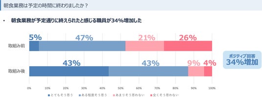 - 食事業務をルール化したことで、記録や他の業務に予定通り取りかかれるようになった。その効果もあり、見守り業務の負担が減り、残業時間の短縮にもつながった