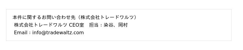 (注1)「TradeWaltz」は日本国内における株式会社トレードワルツの登録商標です。 その他の商品名、会社名、団体名は、各社の商標または登録商標です。