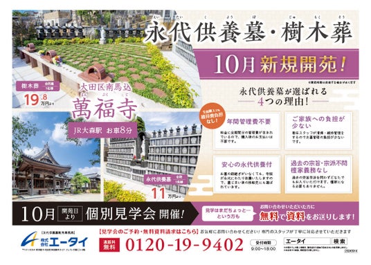 全国に永代供養墓・樹木葬を展開する株式会社エータイ(本社:東京都千代田区、代表取締役:樺山玄基、以下「当社」)は、東京都大田区「慈眼山 萬福寺」(以下「萬福寺」)に永代供養墓・樹木葬を新設し、2024年10月24日(木)より販売受付を開始します。