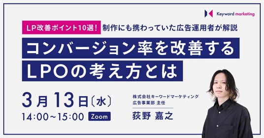 株式会社ベクトル(本社:東京都港区、代表取締役会長兼社長:西江 肇司、東証プライム:6058)の子会社である株式会社キーワードマーケティング(本社:東京都中央区、代表取締役:滝井 秀典)は、無料オンラインセミナー『LP改善ポイント10選!制作にも携わっていた広告運用者が解説 コンバージョン率を改善するLPOの考え方』を3月13日(水)14時より開催いたします。