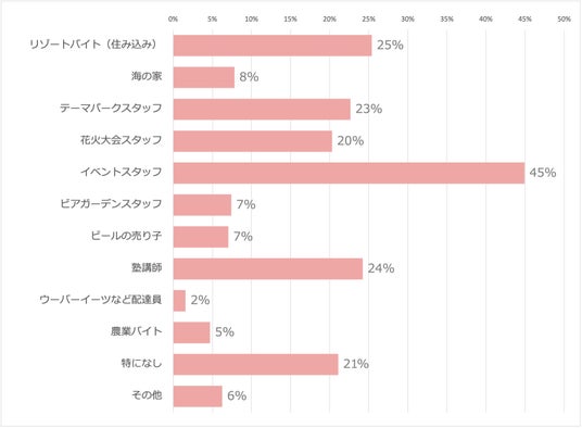 順位では、「イベントスタッフ(45%)」「リゾートバイト(25%)」「塾講師(24%)」「テーマパークスタッフ(23%)」「花火大会スタッフ(20%)」の順に人気であった(特になしを除く)。