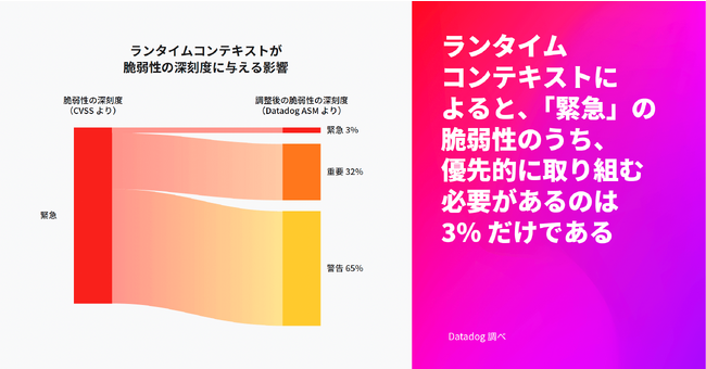 ニューヨーク -- クラウドアプリケーション向けの監視およびセキュリティプラットフォームを提供するDatadog, Inc.※1(NASDAQ:DDOG)は、本日、『アプリケーションセキュリティ調査レポート※2』を発表しました。昨今のDevOps組織を標的とする脆弱性と脅威をよりよく理解するために、Datadogの顧客数千社から得た実際のデータを基に調査しました。本レポートによると、緊急とされた脆弱性のうち、実際にリスクが高く、優先的に取り組む必要があるものは3%に過ぎないことがわかりました。