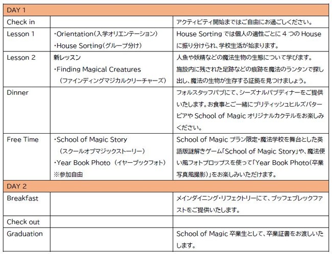 豊かな自然と中世英国の建物を忠実に再現した厳かな施設内で、入学者(宿泊者)は4つの”House”と呼ばれるクラスに分けられ、魔法学校の生徒として学校生活を送ります。ご同伴の方だけでなく、同じ日に入学した仲間も一緒に、本プラン限定の魔法をテーマにした新しいレッスンや、Houseごとの対抗戦、謎解きゲームなどを体験できます。(宿泊部屋はご予約いただいたグループでのご利用です。)