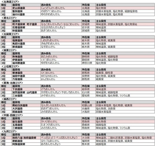 <上信越エリア>不動の1位は草津温泉。日本三名泉の1つであり一度は入りたい天下の名湯は、pH2.0ともいわれる酸性の湯が特徴で、皮膚病・神経痛・糖尿病ほか多くの症状をやわらげる効果が期待できます。昨年ランク外から2位に急上昇した湯田中温泉は、開湯1350年を超える志賀高原の広がる温泉地。5つの地区(湯田中、新湯田中、星川、穂波、安代)にはたくさんの源泉があり、多様な湯を楽しめるのも魅力です。