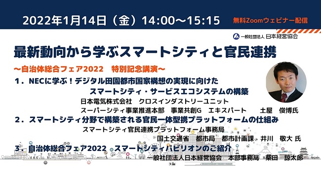 新イベント開催記念として、2022年1月14日(金)14:00~15:15に「最新動向から学ぶスマートシティと官民連携」をテーマに本記念講演を実施いたします。