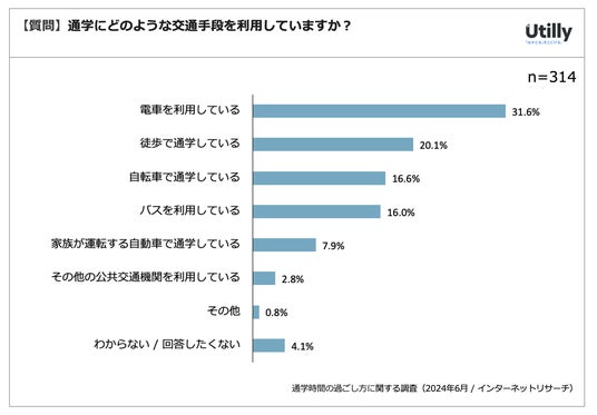 通学に電車を利用していると回答した人は最も多く、31.6%であった。次いで多かったのは、徒歩、 自転車およびバスという結果になった。