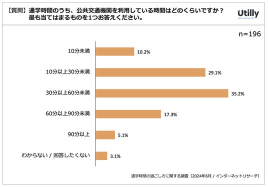 通学時間のうち公共機関を利用している時間については、30分以上60分未満が35.2%でボリュームゾーンとなった。全体としては、60分未満と回答した割合が74.5%であった。一方、5.1%は90分以上と回答した。