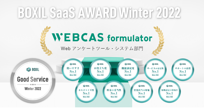 自社開発システム「WEBCAS(ウェブキャス)」と「WOW engage(ワオエンゲージ)」を通して、企業のマーケティングとカスタマーサクセスにおけるコミュニケーションの課題解決を支援する株式会社WOW WORLD(ワオワールド/本社:東京都品川区、代表取締役社長:美濃 和男、以下、WOW WORLD)は、スマートキャンプ株式会社(以下「スマートキャンプ」)が今最も評価されているSaaS(※)を表彰する「BOXIL SaaS AWARD Winter 2022」のWebアンケートツール・システム部門において、当社の提供するアンケート・フォーム作成システム「WEBCAS formulator(ウェブキャス フォーミュレーター)」が「Good Service」ならびに、口コミ評価9項目全てにおいて No.1として選出されたことをお知らせいたします。