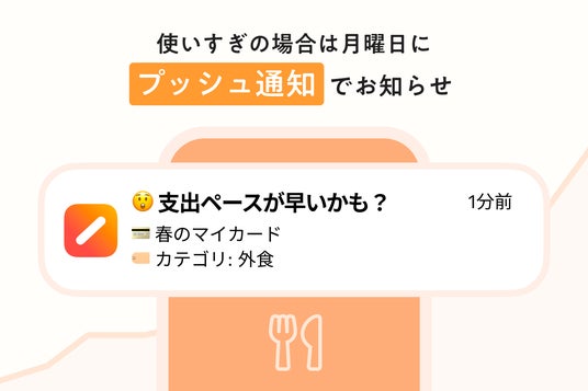 2.特定のカテゴリでお金を使いすぎていたら通知でお知らせ!お金を使いすぎて支出のペースが早い時には、月曜日に通知でお知らせします。これにより、土日で使いすぎたら平日で無駄遣いを抑えるなど、週単位で支出を調整できるようになります。