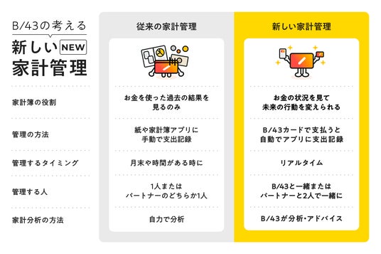 「B/43」とは、プリペイドカードと家計簿アプリがセットになった新しい支出管理サービスです。毎月の予算をプリペイドカードにチャージして支払いを行うだけで、アプリに支出の明細がリアルタイムで反映されるため、簡単に支出管理が可能です。夫婦や同棲カップルで使える「B/43ペアカード」では、一つの口座で二つのカードが作れて面倒な割り勘や現金のやり取りが不要になり、ふたりで一緒に支出を確認できます。また、親子向けの「B/43ジュニアカード」ではキャッシュレスでお小遣いを渡し、親子で一緒にお金の管理ができます。(URL:https://b43.jp/)