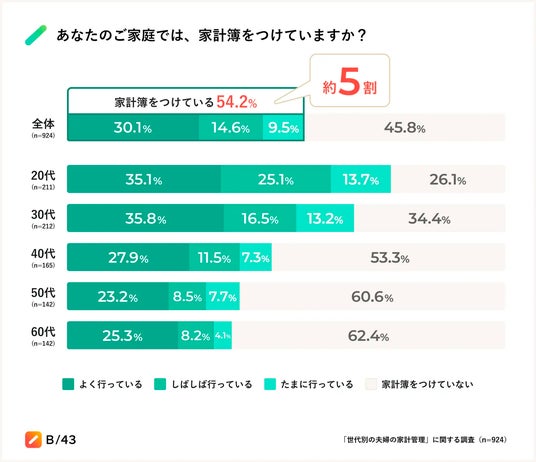 2024年も物価の上昇が続く中で節約志向が高まっています。約5割の家庭が家計簿をつけており、中でも20代では7割の人が家計簿をつけて生活しています。