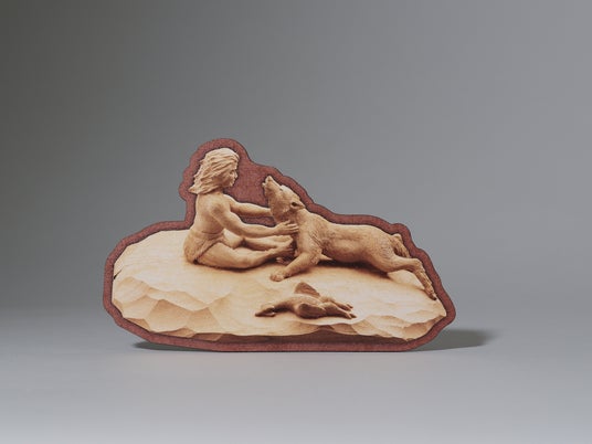 両親とはぐれたアイヌ民族の幼い子どもが狼の家族に助けられ、狼とともに成長していく物語を表現した連作シリーズの作品です。この作品にはエゾオオカミが生きていた時代の埋もれ木が使用されており、人間によって絶滅に追いやられた狼たちへの強い思いが込められています。彼らの物語を通じて、人間と自然の関係性について深く考えさせられる作品です。