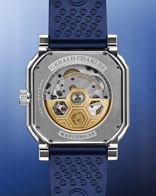 この配色は、マエストロコレクションの特徴であるラバーストラップにも受け継がれています。ジェラルド・チャールズ・ジェンタによってデザインされたこのストラップのクル・ド・パリ装飾は、最高の着用感を優先しながらも、実用的な選択肢を高めています。