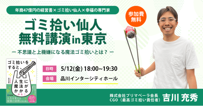 北関東を中心にリユース事業など、4事業部58拠点でグループ年商約47億円の株式会社プリマベーラ(群馬県太田市/代表 吉川充秀)は、「ゴミ拾い仙人 無料講演in東京」を5月12日(金)に品川インターシティホール(東京)にて開催いたします。『ゴミ拾いをすると、人生に 魔法がかかるかも♪』著者の吉川充秀こと「ゴミ拾い仙人」を撮影及び取材することが可能です。