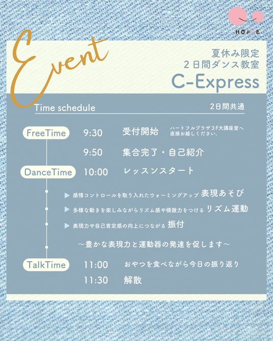 「ダンス教室C-Express」では、“表現ダンスでこどもたちの無限なる可能性を引き出しましょう♪ ”をテーマに、年中~小学2年生までのお子さんを対象としたイベントです。