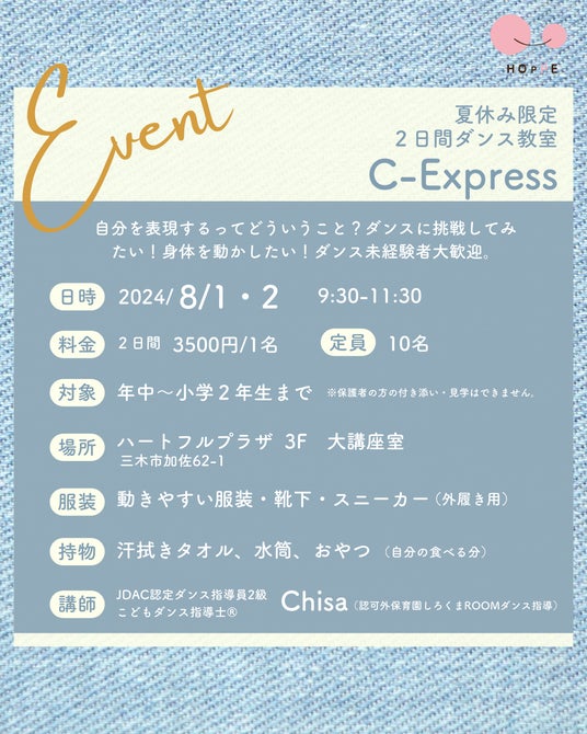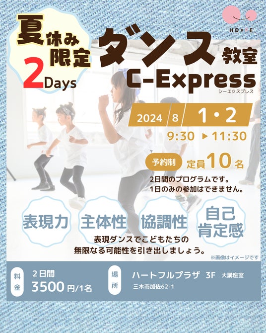 特定非営利活動法人ほっぺ(代表:大森 奈津子)は、サマースクールイベントとして、2024年8月1日(木)、2日(金)にハートフルプラザ3F 大講座室(三木市加佐62-1)にて、「夏休み限定2Daysダンス教室C-Express」を開催いたします。