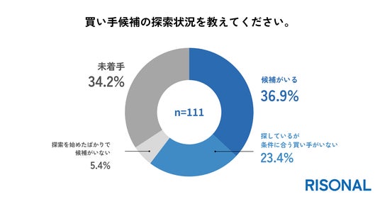 買い手候補の探索状況について尋ねたところ、「候補がいる」が36.9%で最も多かった一方、「未着手」も34.2%と高い割合を占めました。また、「探しているが良い買い手が見つからない」も2割強にのぼりました(n=111)。