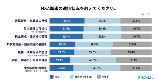 ・準備はなお途上、「税務・法務論点の整理」「非事業資産・遊休資産の棚卸し」「月次管理の可視化」は約4割が未着手