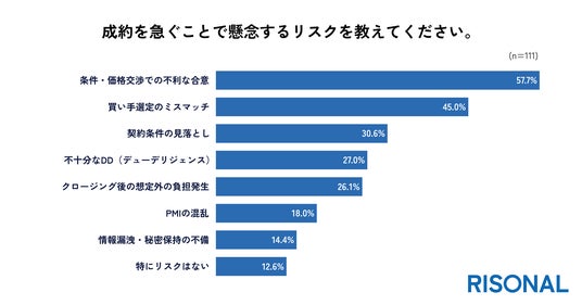 成約を急ぐことで懸念するリスクを尋ねたところ、「条件・価格交渉での不利な合意」が57.7%で最も多く、「買い手選定のミスマッチ」が45.0%、「契約条件の見落とし」が30.6%と続きました。