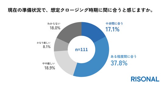現在の準備状況で、想定しているクロージング時期に間に合うと感じているかを尋ねたところ、「十分間に合う」が17.1%、「ある程度間に合う」が37.8%で、合わせて過半数を占めた一方で、「やや厳しい」と「かなり厳しい」が合わせて27.0%、「わからない」が18.0%で、45.0%が想定クロージングに懸念を抱いている実態が浮き彫りになりました(n=111)。
