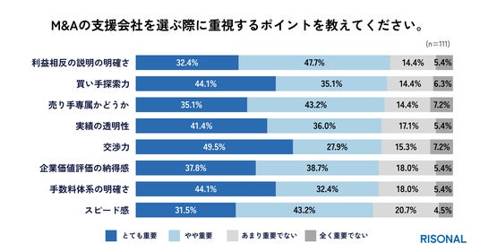 売り手にとって不利益を避けるための透明性や立場の明確さに加え、買い手探索力や交渉力といった実務遂行力も重視されており、売り手保護と実行支援の両立が求められていることがわかります(n=111)。