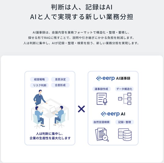 当社は今後も、企業の管理部門における生産性向上を支援するAIプロダクトの開発を推進してまいります。AI議事録ツールは、当社が提供するAIRAG「eerp AI」とも連携しており、会議で決定した内容をそのままRAGナレッジとして活用することで、会社全体の「記録から検索まで」をシームレスにつなぐ業務基盤の構築を目指します。