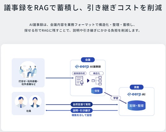 株式会社コマースロボティクス(本社:東京都港区、代表取締役:伊藤彰弘)は、議事録を企業の知識基盤へと進化させる、RAG連動型AI議事録ツール「eerp AI議事録」の提供を3月1日から開始いたしました。