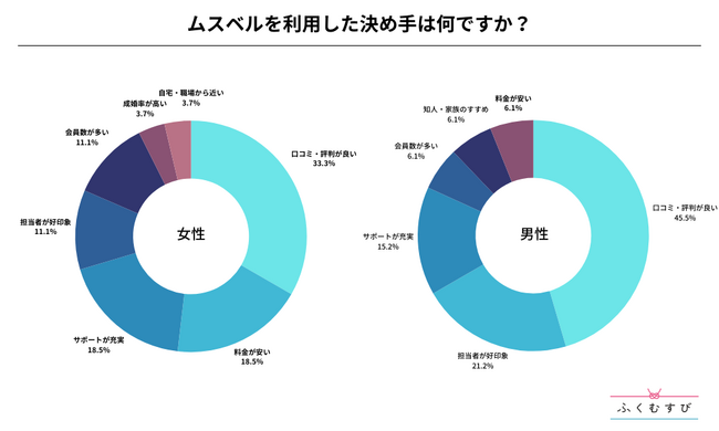 ・女性がムスベルを利用した決め手は、口コミ・評判が良いが1位、料金が安いが2位となりました。