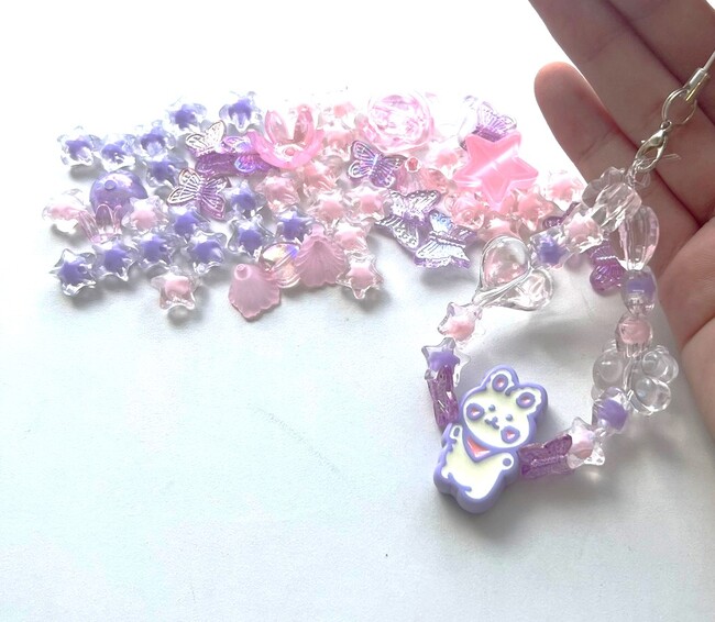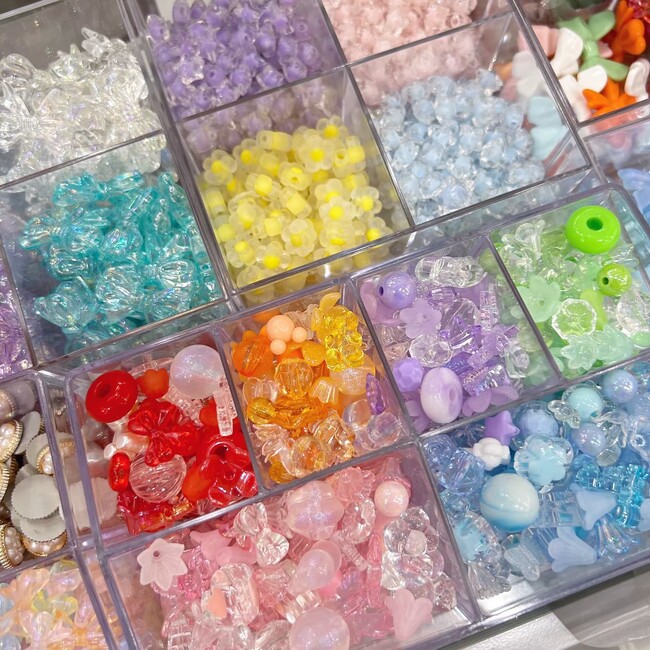 お菓子みたいにカラフルで可愛いデコパーツやビーズセットがお得なセットで販売予定です。カラー別のビーズアクセサリー制作やトレカデコにぴったりの商品となっております。(販売価格:1000~1500円)