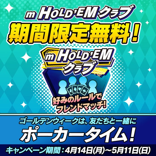 参加メンバーやシーンに合わせてプライベートマッチが楽しめる「m HOLD’EMクラブ」が無料で遊べるキャンペーンを実施いたします!ゴールデンウィークに、お友達同士でチャットをしながらポーカーを楽しんでみてはいかがでしょうか。