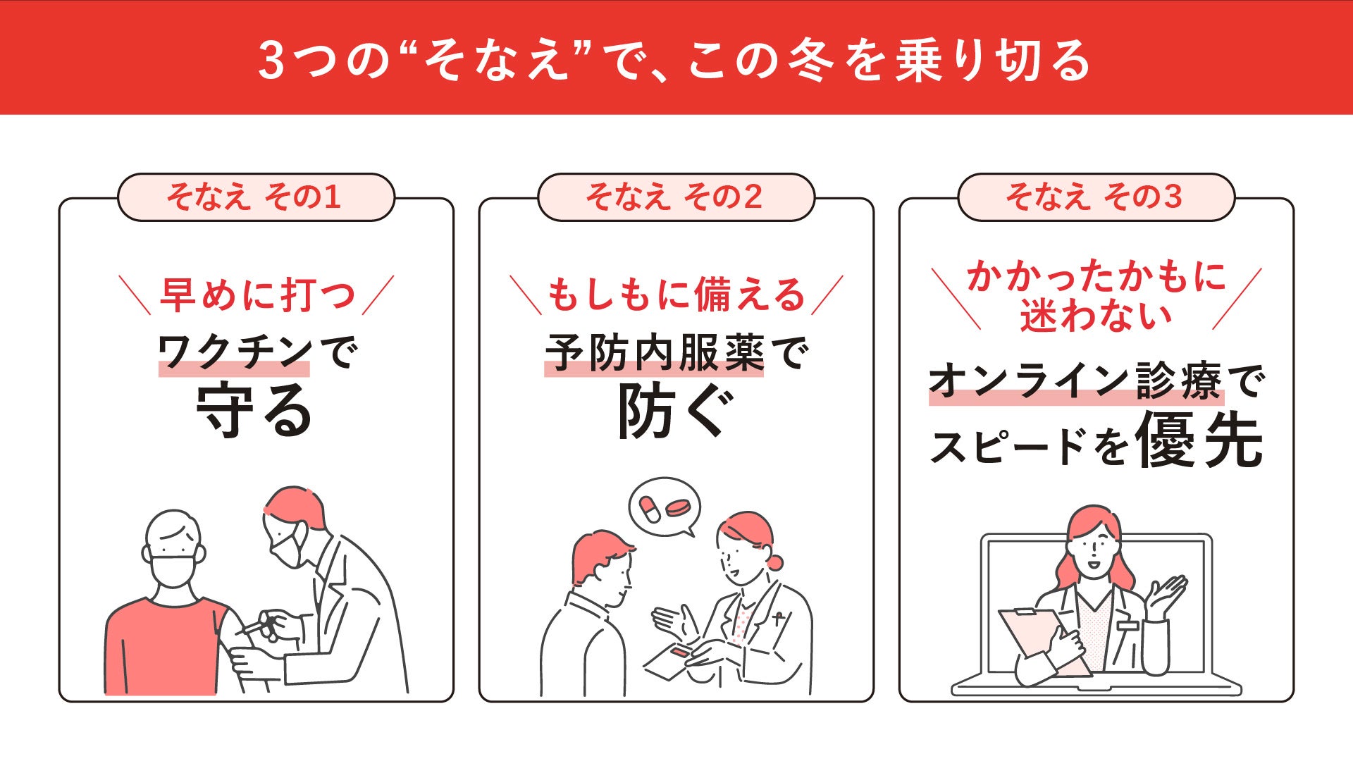 「今年は例年よりも早くインフルエンザの流行が始まっており、ピークが長引く可能性もあります。早めのワクチン接種と、オンライン診療や予防薬といった手段をうまく組み合わせることで、“感染しない・広げない”冬を迎えられると考えています。」