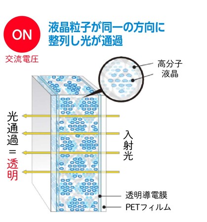 スイッチONで、電圧をかけることによりフィルム内の液晶分子が均一に整列し、光を通すことで【透過】します。