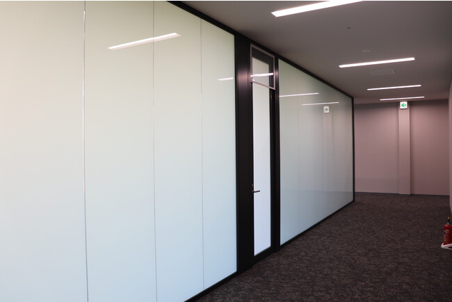 「N-Smart」は、スイッチのON・OFFでガラス面の【透過・非透過】の切り替えが出来る自社ブランドの調光ガラス資材です。調光フィルム(以下、「フィルム」)をガラスで挟んだ“合わせガラス”仕様で、フィルムが空気や湿気に触れないためフィルムを後貼りする方法よりも品質を保つことができ、電極が露出しないため意匠性の高い施工ができます。