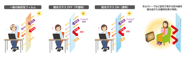 「ノーマルタイプ」に加え、調光ガラスのスイッチOFFで【透過】・ONで【非透過】操作ができる「リバースタイプ」、遮熱性能を高めた「遮熱タイプ」を新たに追加。全3種類のラインアップで会議室や応接室等での使用に限らず、紫外線の当たるサンルームや屋外に面する窓での活用など、様々な空間演出にお役立ていただけます。全ラインアップ、紫外線カットを含めたリニューアル仕様です。