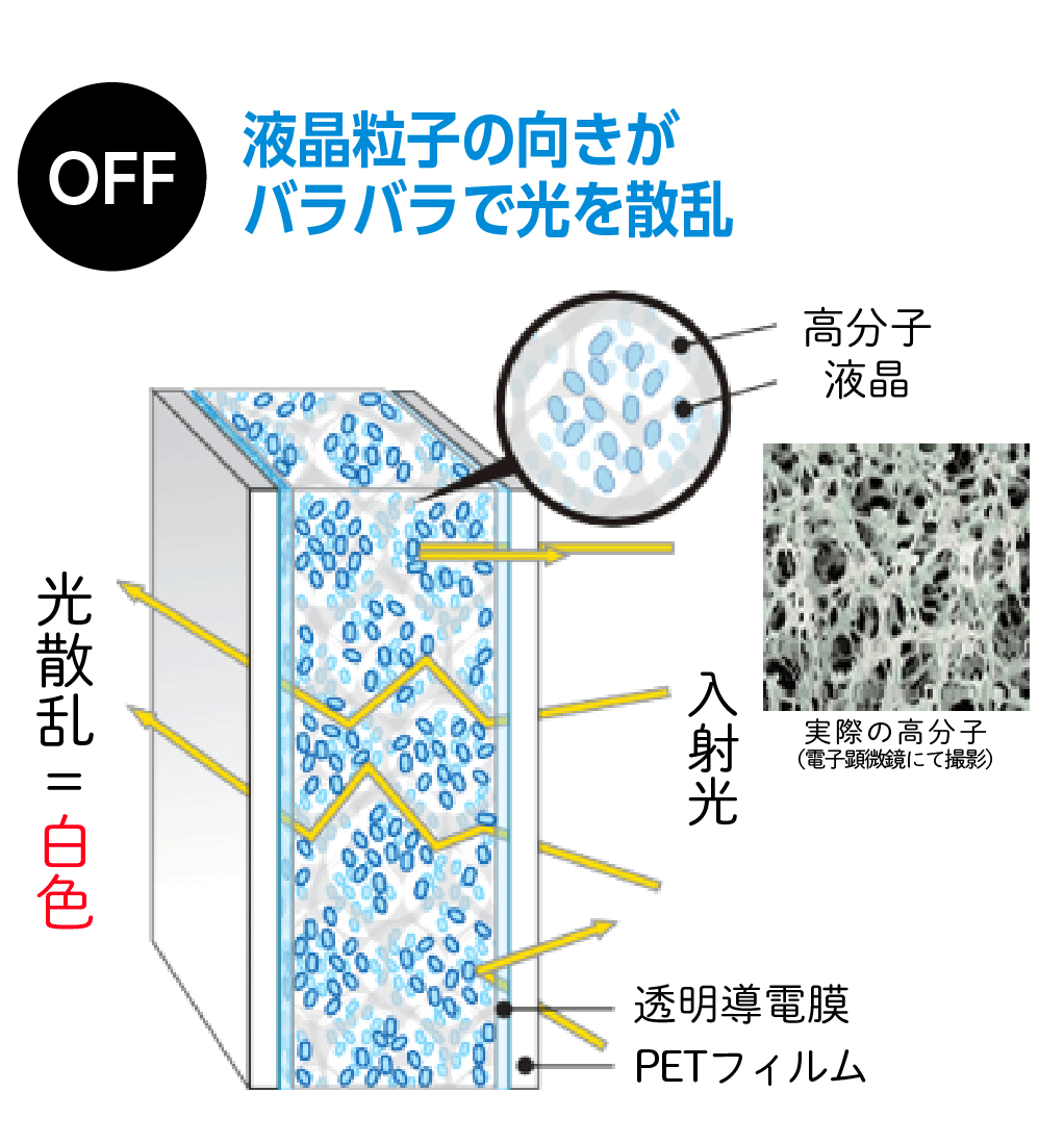 スイッチOFFの状態では、フィルム内にある液晶分子が不規則に並び、光が吸収・拡散され【非透過】状態になります。