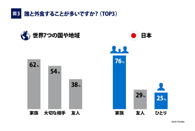 「誰と外食することが多いですか?」という質問に対して、日本は、上位から順に「家族(76%)」、「友人(29%)」、「ひとり(25%)」となりました。3番目に「ひとり」での外食機会が入るなど、世界7つの国や 地域の平均の上位3位、「家族(62%)」、「大切な相手(54%)」、「友人(38%)」と比較しても、 「ソロ外食」を楽しむ人たちが多いことを示す結果となりました。【図3】