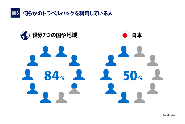また、世界7つの国や地域の平均では84%が、「朝食無料のホテルを選ぶ」、「旅行特典付きクレジットカードを利用する」、「旅行者が少ないと思われる曜日や時間に予約をする」など、飛行機やホテルなどをお得に 予約・活用しながら旅行する手段としての「トラベルハック」を駆使しています。日本でも「トラベルハック」を駆使していると50%が回答し、半数がお得に旅をするための手段を活用しているという結果になりました。【図6】