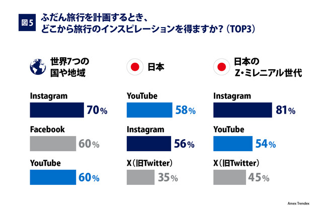 「ふだん旅行を計画するとき、どこから旅行のインスピレーションを得ますか?」という質問に対して、ソーシャルメディアと回答した人が7つの国や地域の平均で49%、日本でも45%と多くの割合を占める結果となりました。旅行のインスピレーションを得るソーシャルメディアとして、日本は上位から「YouTube(58%)」、「Instagram(56%)」、「X(35%)」となっており、世界7つの国や地域の平均では「Instagram(70%)」、「Facebook(60%)」、「YouTube(60%)」の順となりました。【図5】