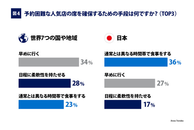 「予約困難な人気店の席を確保するための手段は何ですか?」という質問に対して、世界7つの国や地域の平均では、上位から「早めに行く(34%)」、「日程に柔軟性を持たせる(28%)」、「通常とは異なる時間帯で食事をする(23%)」でした。日本は、「通常とは異なる時間帯で食事をする(36%)」、「日程に柔軟性を持たせる(17%)」、「早めに行く(27%)」となっており、最も活用されている手段は、ピークの時間を避けるというものでした。【図4】